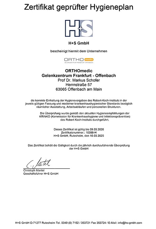 Die H + S GmbH hat unserer Praxis im März 2024 das Überwachungszeichen „Zertifikat geprüfter Hygieneplan“ ausgestellt und der Hygieneplan wurde am 10.03.2025 erneut zertifiziert.